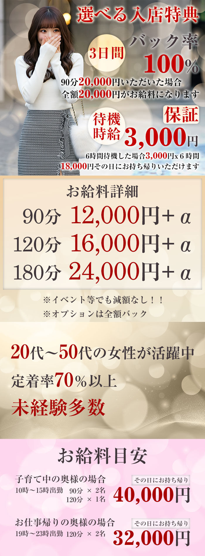 ◆選べる入店特典⇒入店3日間バック率100%or待機保証時給3,000円◆